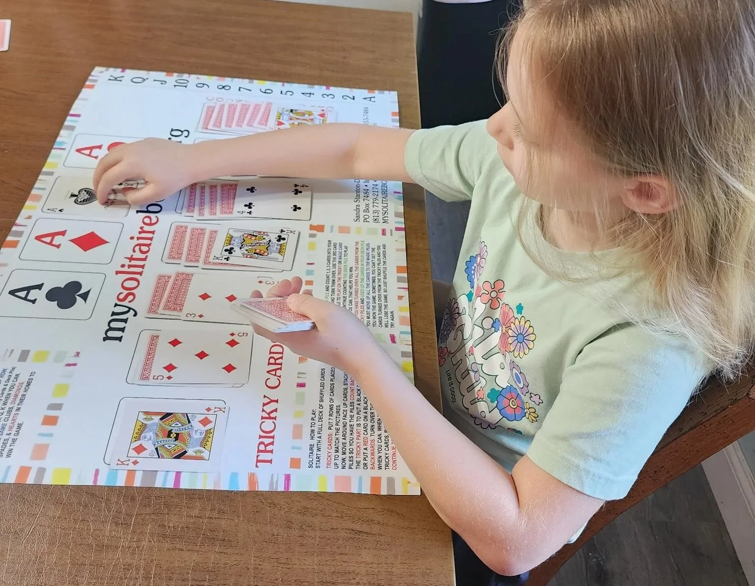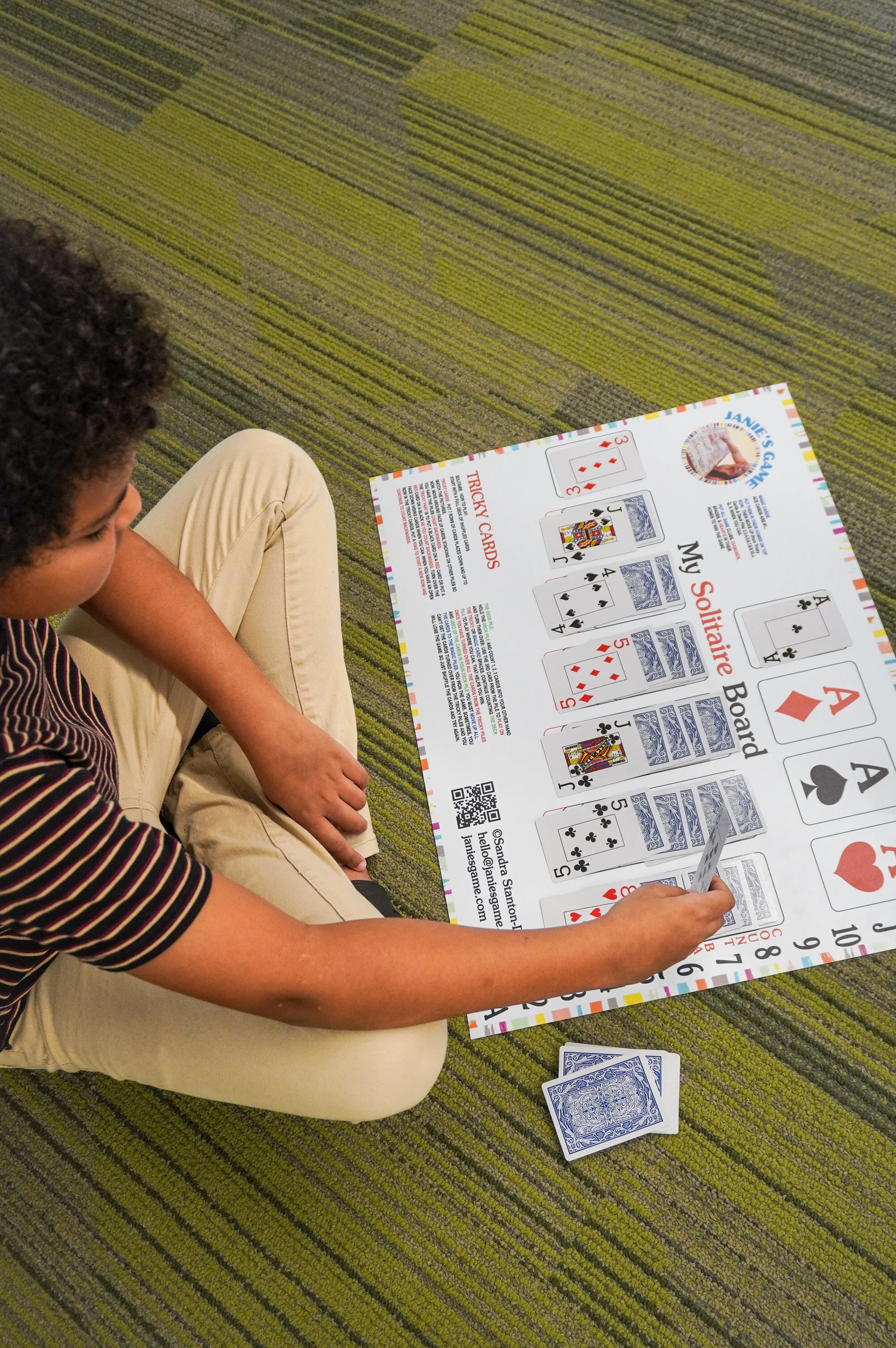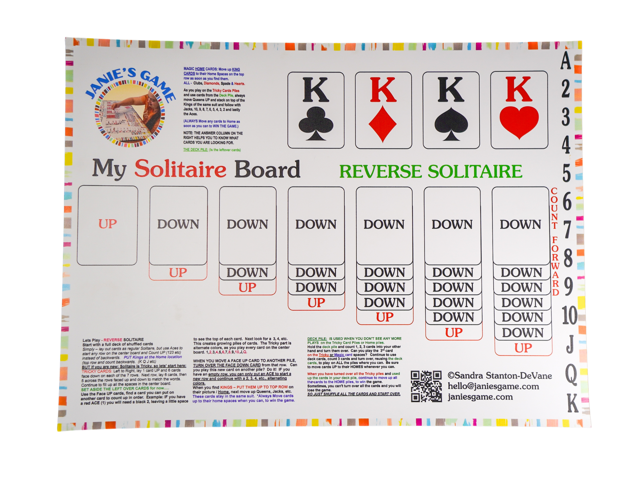 Our two- sided game board is 18” x 24” with Regular Solitaire and Reverse Solitaire on the back. On the front side is a numbered column that supports forward counting as players build from Ace up to King. The reverse side guides backward counting as players work from King down to Ace. This built-in organization helps strengthen important skills like sequencing, memory, and flexible thinking.