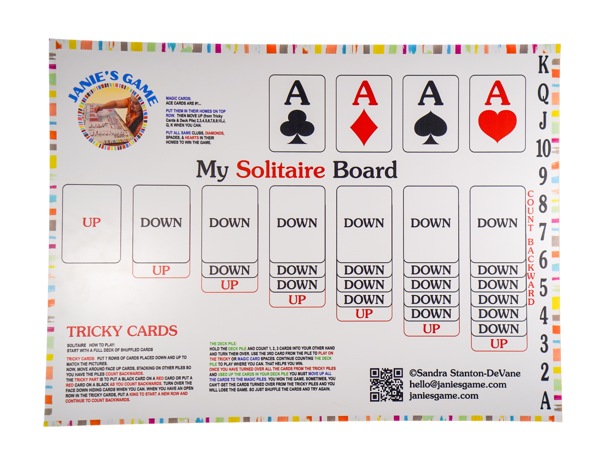 Janie’s Game is special and a perfect teaching tool for young children all the way to senior adults. The board design makes it easy for people with different abilities, including those with Down Syndrome, Autism, ADHD, or Seniors facing memory challenges.